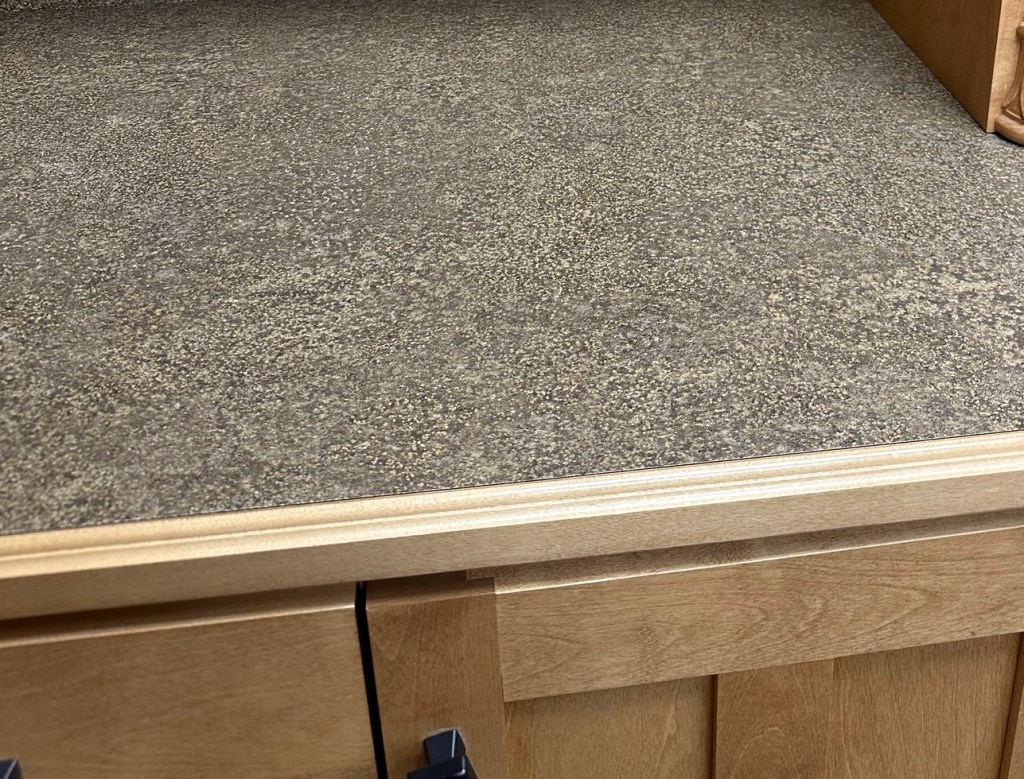 Next on my list of changes to make were our kitchen countertops and backsplash. They were also original to the house. Our backsplash consisted of large, diagonal beige tiles, and our countertops were a very textured brown laminate with a wood front. It may have been the kitchen of my mom’s dreams 20 years ago, and she thought I was crazy for wanting to change it because it was still beautiful to her. The texture in the countertop made it less than idea for baking, and it had to be scrubbed, rather than just wiped clean. Between the color and the texture, I never felt like it was fully clean, even after being scrubbed down. The backsplash and countertops needed updating.