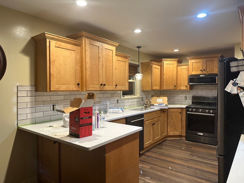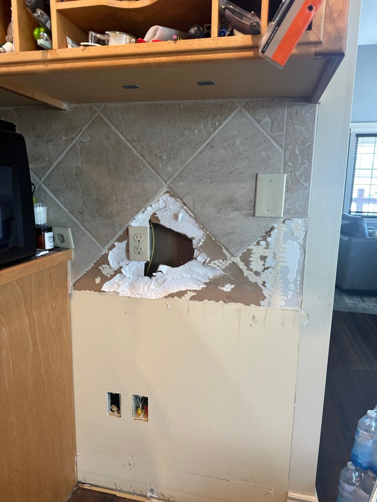 Our backsplash was stubborn, and it didn’t want to be pulled off of the walls. It had to be cut out and the walls re-sheet-rocked. That happened last week.